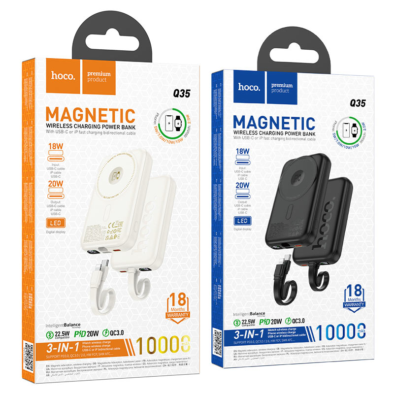 Q35 Portable, power bank with magnetic wireless charging, 10000mAh, 2.5W / 5W / 7.5W / 10W / 15W wireless output, dual Type-C input / output, single input / output for iP, Type-C to iP cable, LED digital display, support fast charging protocols